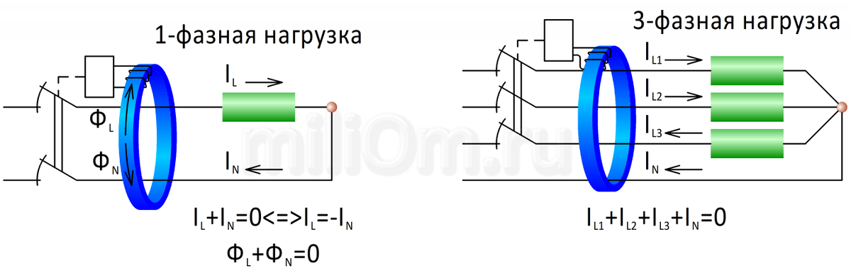 Если обратиться к законам электротехники, то по Первому закону Кирхгофа сумма токов сходящихся в электрической точке равна нулю, то есть сумма входящих токов равняется сумме исходящих токов. Электрическая нагрузка, коей являются наши электроприемники, по своей сути и есть такая точка в которой сходятся питающие провода. Значит, если ток протекает только через элементы нагрузки, то сумма токов в проводах, подключенных к нагрузке, равна нулю.