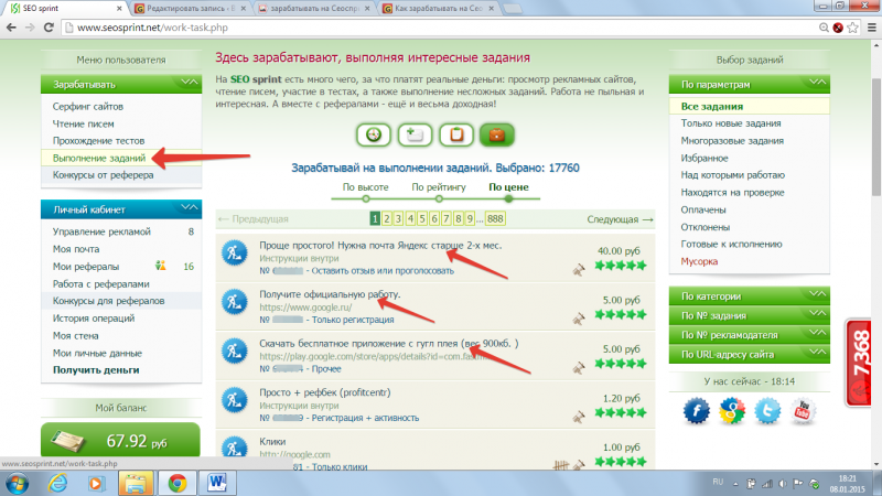 - Выполнение заданий – этот вид деятельности на СеоСпринт позволяет заработать по максимуму. Стоимость выполненного задания здесь находится в пределах от 1 рубля до нескольких сотен рублей. Чтобы пользователям было удобно искать нужное задание, все они разделены на определенные категории.