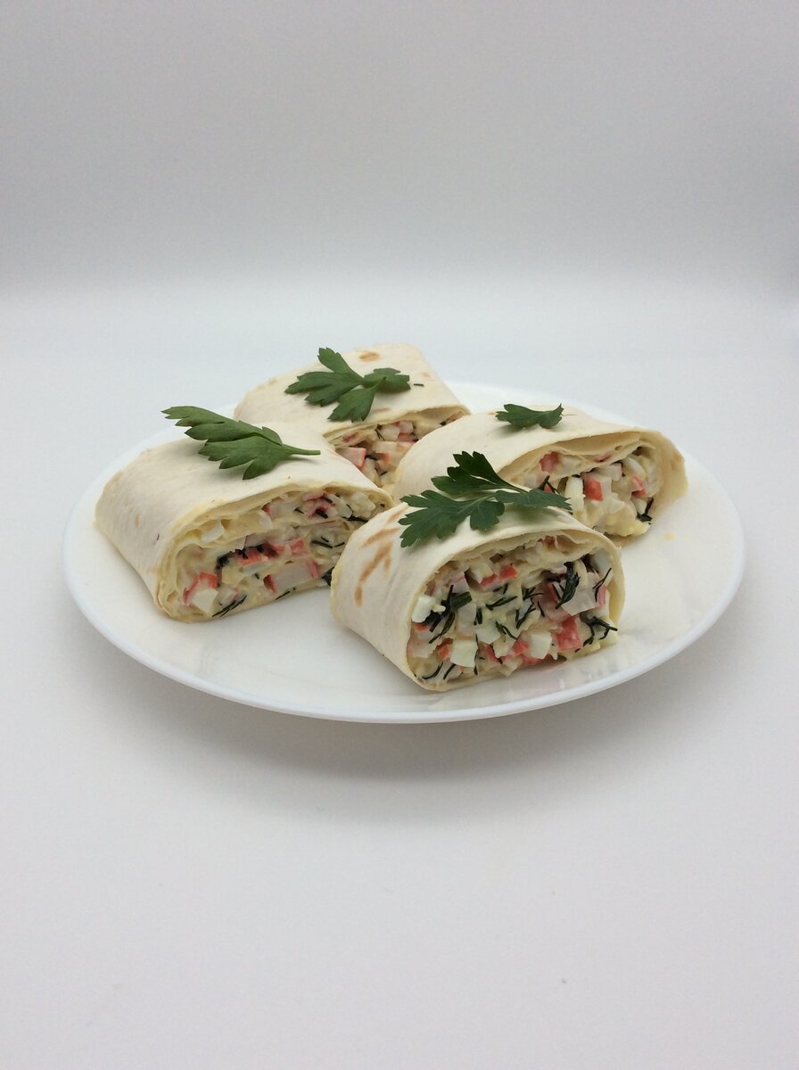 Разрезаем и подаём. Рулет из лаваша с крабовыми палочками готов