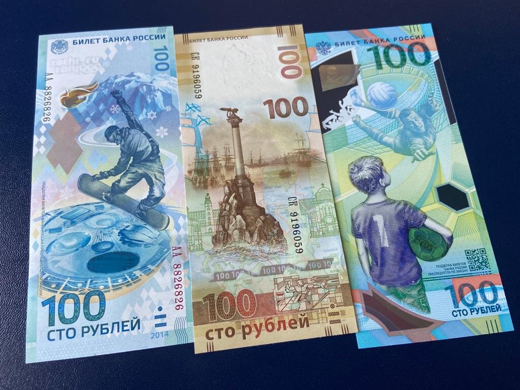 Итак, всего в России было выпущено три вида памятных банкнот. Они были посвящены таким событиям, как Олимпиада в Сочи, Присоединение Крыма и Севастополя к Российской Федерации, а также Чемпионат мира по футболу в России в 2018 году. Всё памятные банкноты имеют вполне ходовой номинал 100 рублей.