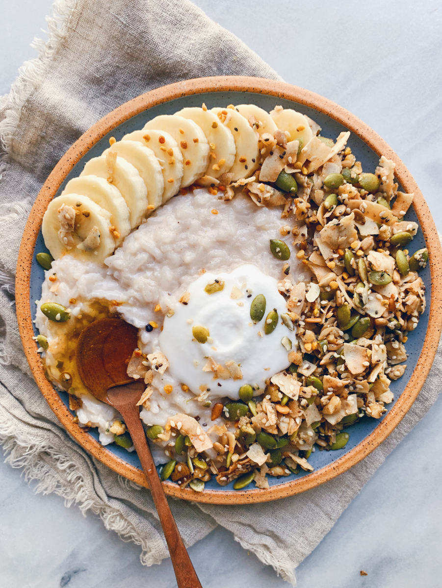 Очень просто: готовьте на кокосовом молоке. Его также добавляют в конце приготовления, когда рас уже достаточно разварился. В этом случае логично добавить в готовую кашу ложечку кокосового масле вместо сливочного.