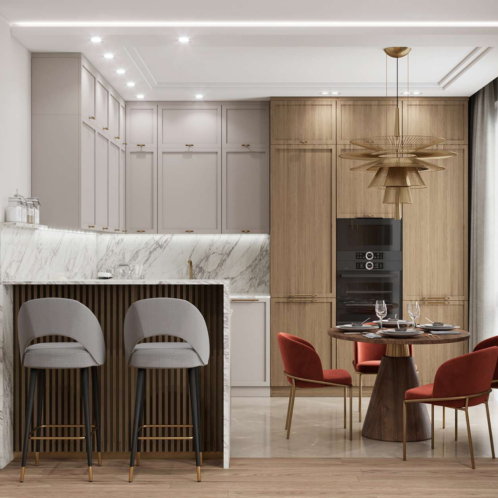 Всё чаще дизайнеры проектируют кухни до потолка. Помещение и кухонный гарнитур становятся единым целым. Смотрится современно и стильно.