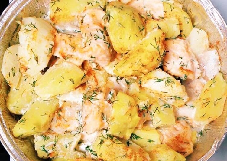 Берём форму для запекания, немного смазываем её подсолнечным маслом. Выкладываем картофель, и рыбу, сверху сметану, соль, специи и всё тщательно перемешиваем прямо в форме.