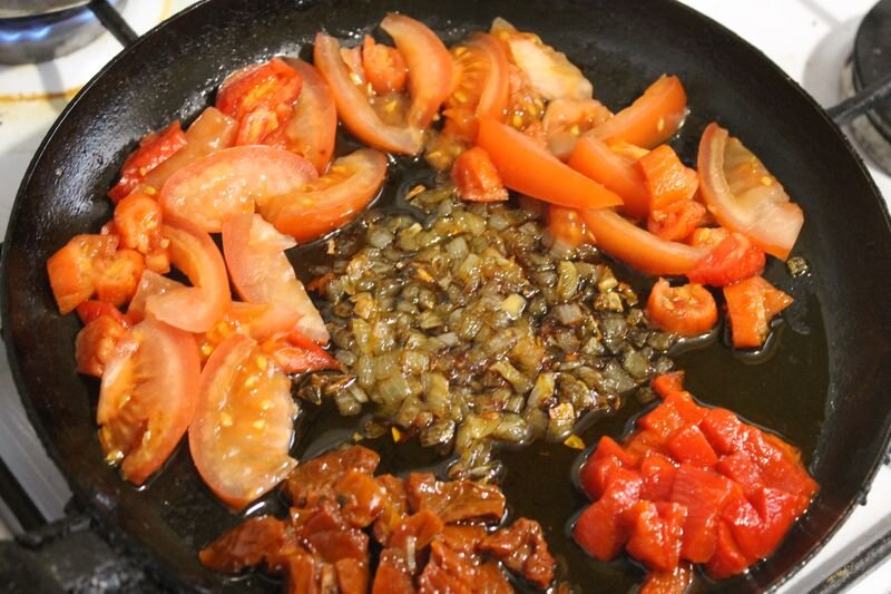 Пока спагетти варятся поджариваем на сковородке лук репчатый на сливочном масле, к поджаренному луку добавляем некрупно порезанный свежий помидор, болгарский перец, вяленые помидоры и всё поджариваем до мягкого состояния.