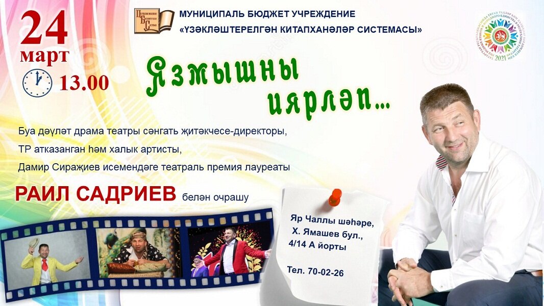 24 март көнне 13.00 сәгатьтә шәһәр үзәк китапханәсенә Буа дәүләт драма театры сәнгать җитәкчесе-директоры, Татарстан Республикасы атказанган һәм халык артисты, Дамир Сираҗиев театраль премиясе лауреаты Раил Садриев белән очрашуга чакырабыз.