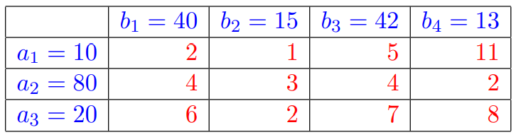 Для краткости в матрице плана перевозок не пишем нулевые значения небазисных перевозок. Число ненулевых элементов в первоначальном плане перевозок m + n − 1 = 3 + 4 − 1 = 6. Суммарная стоимость перевозок будет ⟨c, x ⟩ = 2 · 10 + 4 · 30 + 3 · 15 + 4 · 35 + 7 · 7 + 8 · 13 = 478.