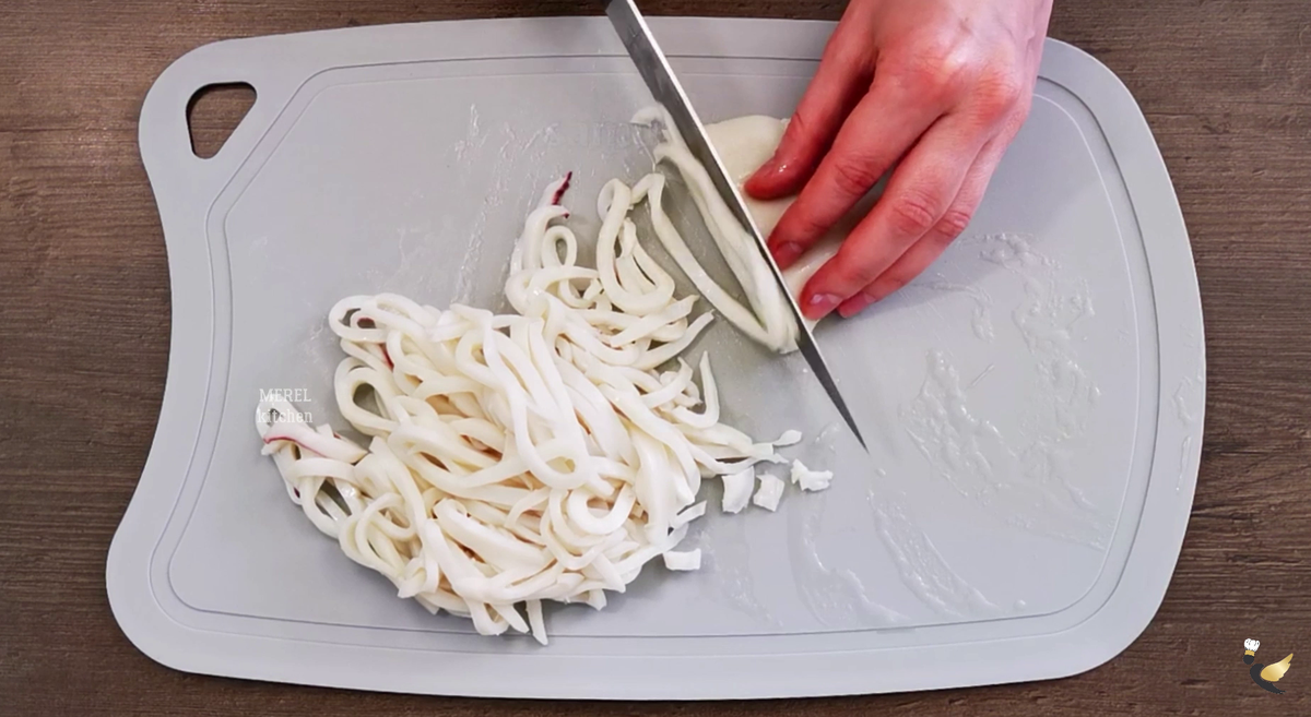 Для приготовления я беру отварного кальмара четыре штуки и режу его тонкой соломкой. Для этого салата кальмара я варю всего пару минут, опуская в кипяток, если варить дольше, кальмар получится жестким.