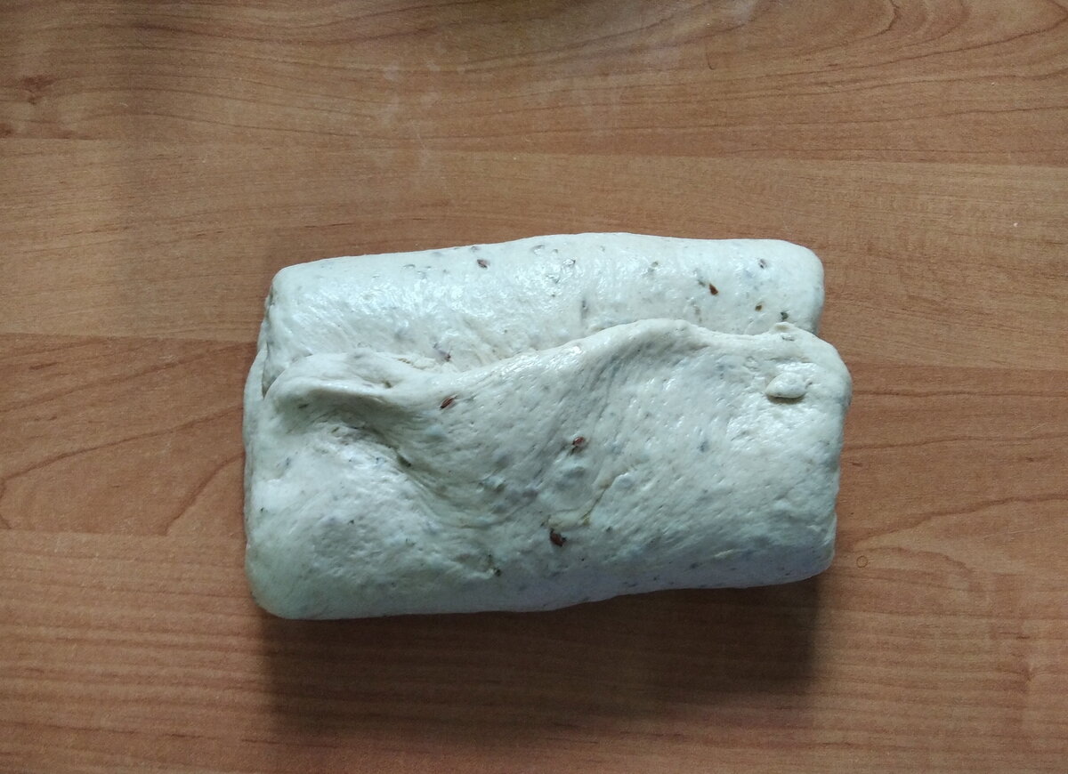 5. Через час тесто выкладываем на стол (посыпать мукой или смазать растительным маслом), растягиваем и складываем конвертом. Одну сторону, потом другую, переворачиваем и опять растягиваем. После этого перекладываем в чашу, опять закрываем плёнкой или полотенцем и оставляем ещё на 1 час. Повторяем процедуру складывания три раза.