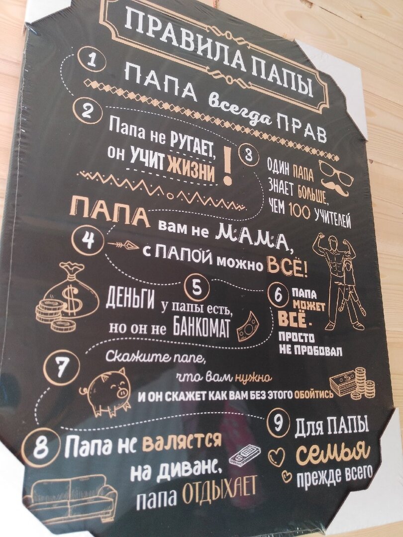 Сама картина выглядит достойно и стильно. Печать качественная, шрифт крупный, правила понятные. Подарили мы эту картину мужу на тридцатилетие. Фактически, она выполнила роль большой открытки и стала отличным дополнением к другим подаркам.