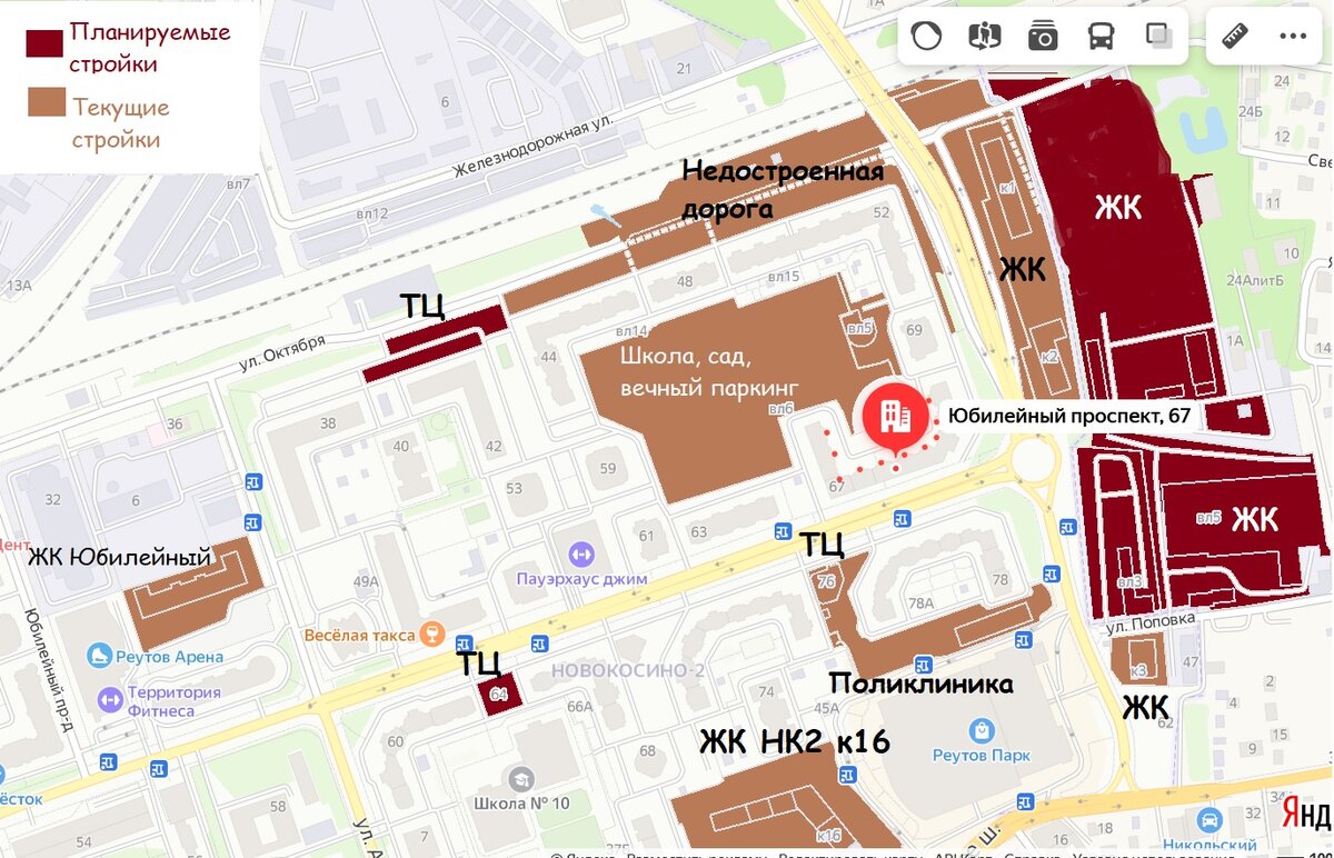 1. Карта мкр 10а го Реутов с обозначенными стройками, текущими и планируемыми.
