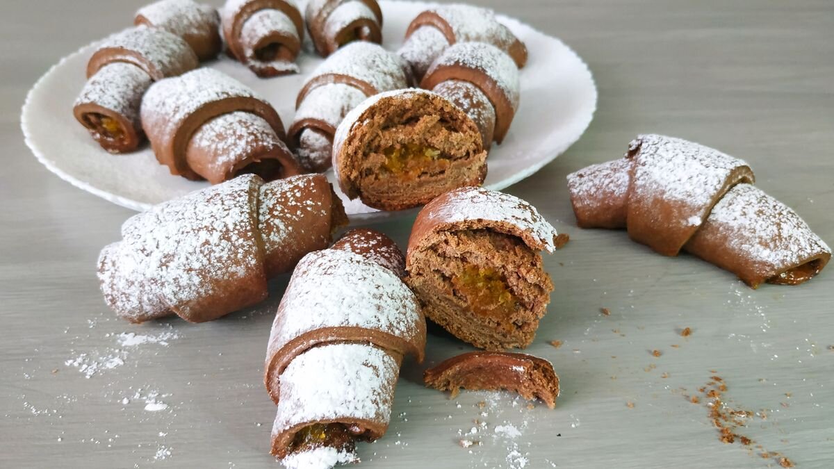 Эти шоколадные рогалики очень просты в приготовлении. Продукты для них доступны каждому. Готовим их из теста на рассоле без добавления яиц и молочных продуктов. Такие постные рогалики с начинкой из варенья получаются очень вкусными, никто и не догадается, из чего приготовлено тесто.