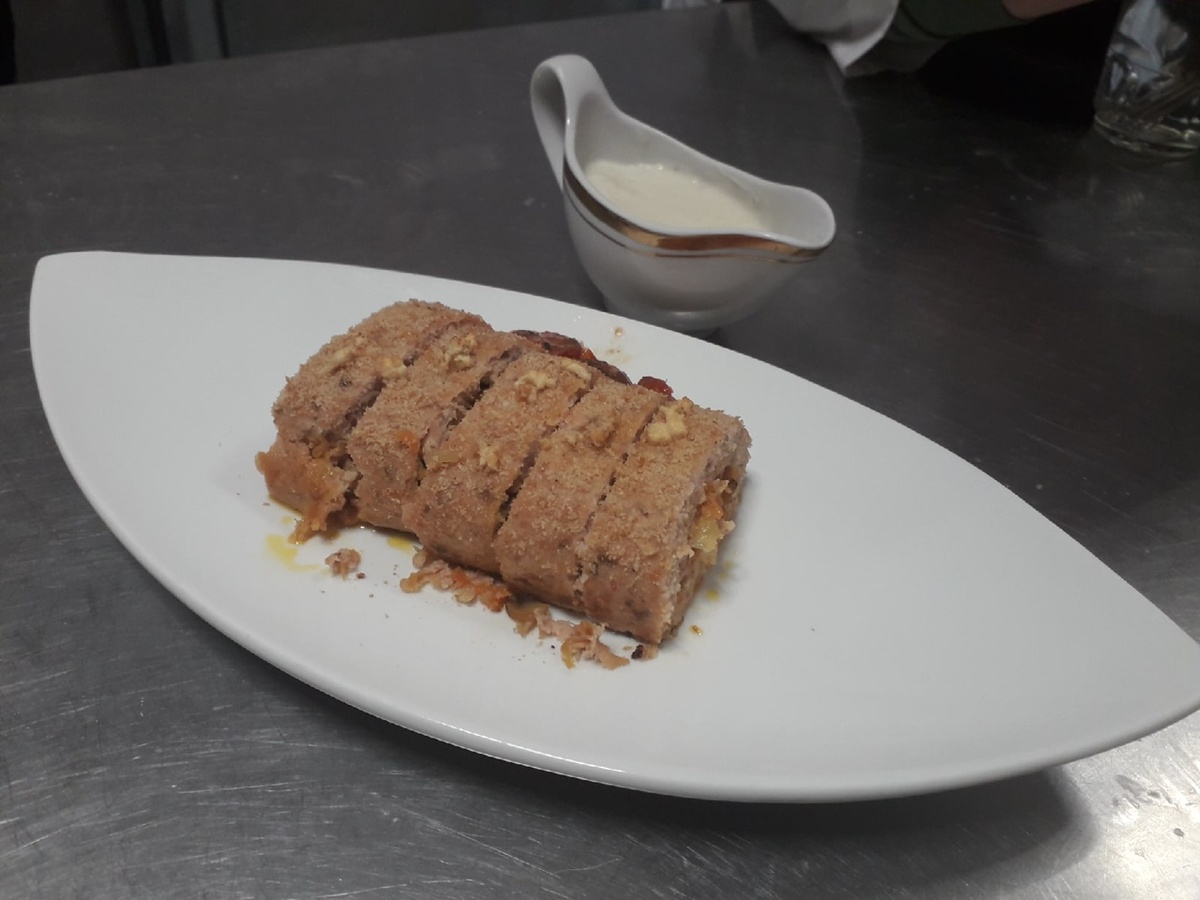 Готовую котлетную массу из рыбы раскладываем на пищевую пленку слоем 1.5-2 см,на середину вдоль слоя кладем фарш,который мы сделали.Соединяем края так,чтобы один край котлетной массы прикрыл другой,образуя рулет.После убираем пищевую пленку.Этот сформованный рулет перекладывают на противень смазанный маслом.Поверхность рулета посыпают сухарями,сбрызгивают жиром,прокалываем ножом в 2-3 местах и запекают п4-5ри температуре 250-280 С в течении 15 минут.При подаче можно нарезать 4-5 кусочков.Подавать можно с соусом.
