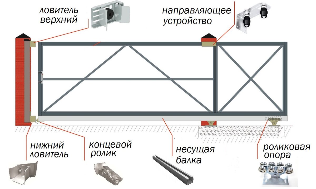 Для этого, кроме заполнения полотна (профлист, евроштакетник, вагонка и тд), изготовления силовой рамы (профилированная труба), вам понадобятся комплектующие, непосредственно отвечающие за движение полотна.