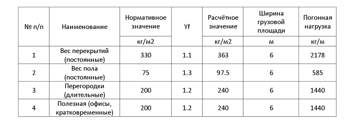 Предположим, что в ходе реконструкции здания, планируется изменить функциональное назначение помещения, нагрузку от которого воспринимает балка. После реконструкции там предполагается разместить торговый склад, нагрузка от которого равна 500 кг/м2. Также, в ходе реконструкции, планируется поменять конструкцию пола и расположение перегородок, однако нагрузка от пола и перегородок останется без изменений. Выполним сбор нагрузок с учётом изменения функционального назначения помещений: