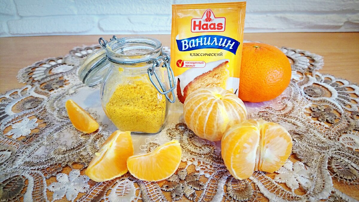 Для него понадобится только мандариновая кожура. Я еще добавляю немного ванилина. Так мандариновый порошок приобретает более интересный и многогранный аромат. Но это дело вкуса, кому как нравится. Можно ванилин не добавлять.