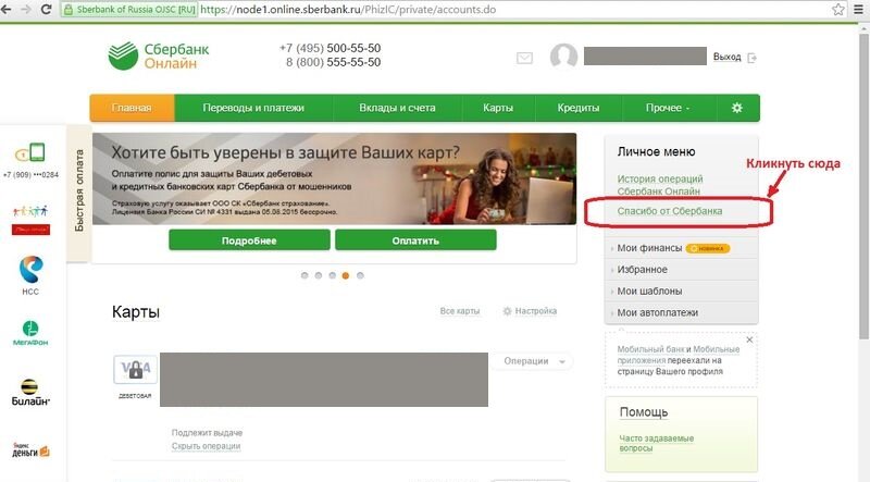 - На главной странице сайта справа находится раздел «Спасибо от Сбербанка», где отображается количество накопленных бонусов.