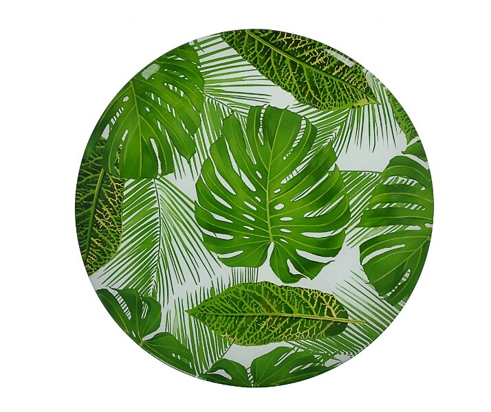 Итак, у нас есть роскошные подстановочные стеклянные тарелки "Тропики" диаметром 23 см. Она может стать как основным предметом для подачи блюд, так и основой для белоснежной обеденной тарелки.