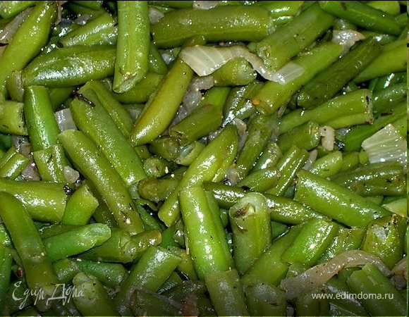 Жарим в два этапа - сначала следим когда вода, стекшая с фасоли (когда она разморозится), выкипит. Потом чуть подрумяниваем фасоль.