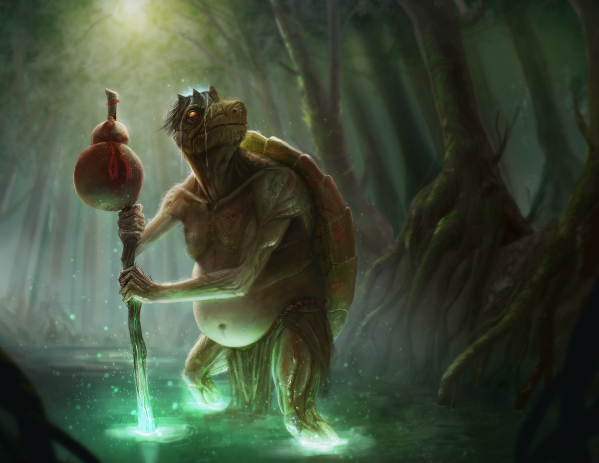 √ Разновидность водяных, воплощение божества Воды. Их внешний вид весьма специфичен — нечто среднее между лягушкой и черепахой: лягушачья кожа, вместо носа — клюв, пальцы на руках и ногах соединены плавательными перепонками, на голове короткая шерсть.Две руки каппы соединены друг с другом в районе лопаток; если потянуть за одну, то другая сожмётся или вообще может выпасть.Каппа является почитателем борьбы сумо и любит огурцы, рыбу и фрукты. Считается, что если поймать каппу, то он выполнит любое желание. Считался в Японии очень опасным существом, которое промышляло тем, что заманивало хитростью или затаскивало силой людей и животных в воду