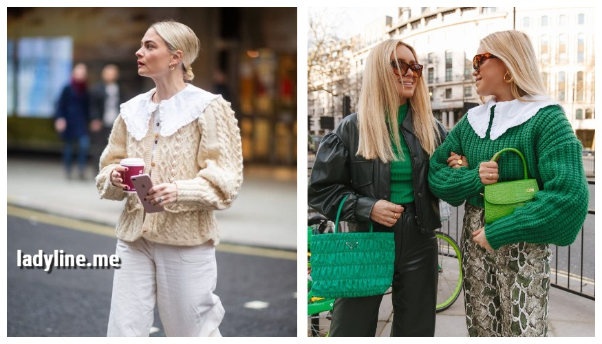 Хлопковые белоснежные накладные воротнички отлично смотрятся в одном тандеме с вязаными уютными вещами. Для «ВАУ» эффекта лучше выбирать вещи контрастных оттенков, тогда трендовый аксессуар будет выигрышно выделяться на их фоне. Данное сочетание можно носить, как с базовыми джинсами, так и классическими брюками из натуральной ткани или же цветной кожи.