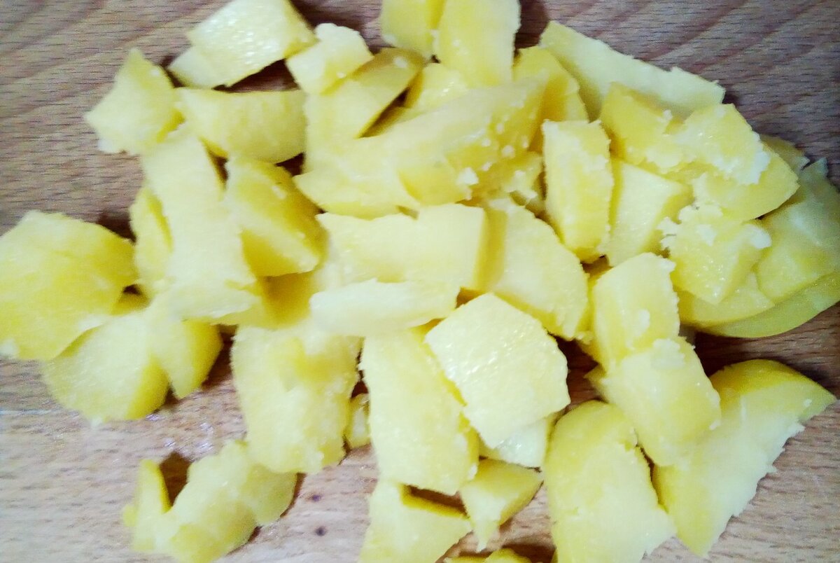 На салатницу у меня ушло 3 средние картофелины, 3 яйца, луковица, грамм 300 квашеной капусты и 3 ложки нерафинированного подсолнечного масла.