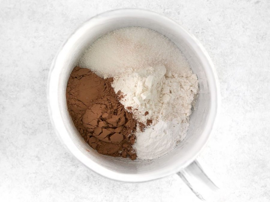 1 . Приготовление коржей . Тщательно перемешиваем муку , разрыхлитель , какао и сахарный песок .