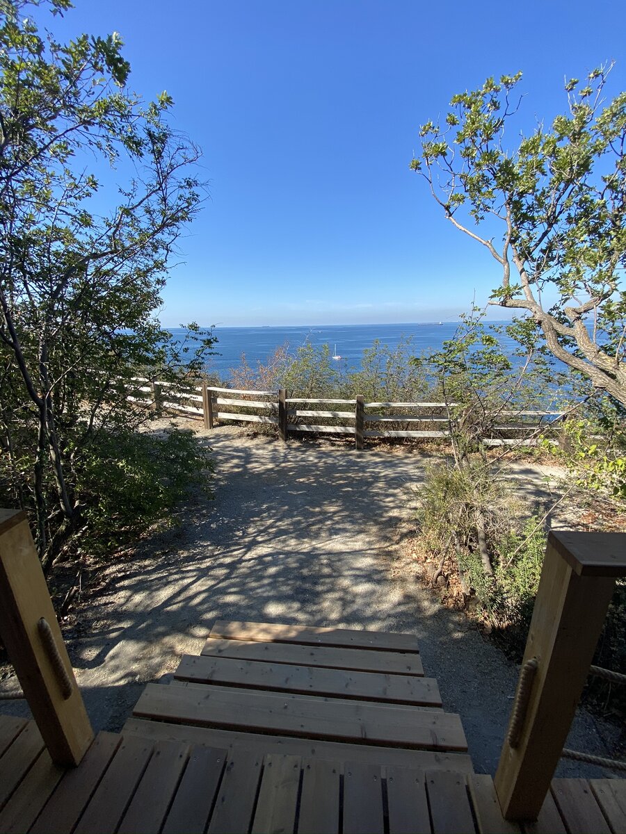 Спуск к морю железная лестница, пляж каменистый, дети усиленно пытались играть там с лопатками. Вход в воду сделали мостик с лестницей, так как у берега зайти невозможно, слишком большие камни. В общем-то, это полноценный дикий пляж с доступом к нему. Дети купались в кроксах, камни в море не очень приятные.