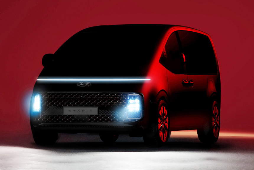 Это не концепт-кар и не челнок из фантастического фильма. На темных тизерах изображен будущий серийный минивэн Hyundai Staria. Единая светящаяся полоса переднего ходового огня, основные фары по краям решетки радиатора, чистые линии и скупая пластика кузова: те приемы, которые мы привыкли видеть на шоу-карах, корейцы решились использовать на товарной модели.