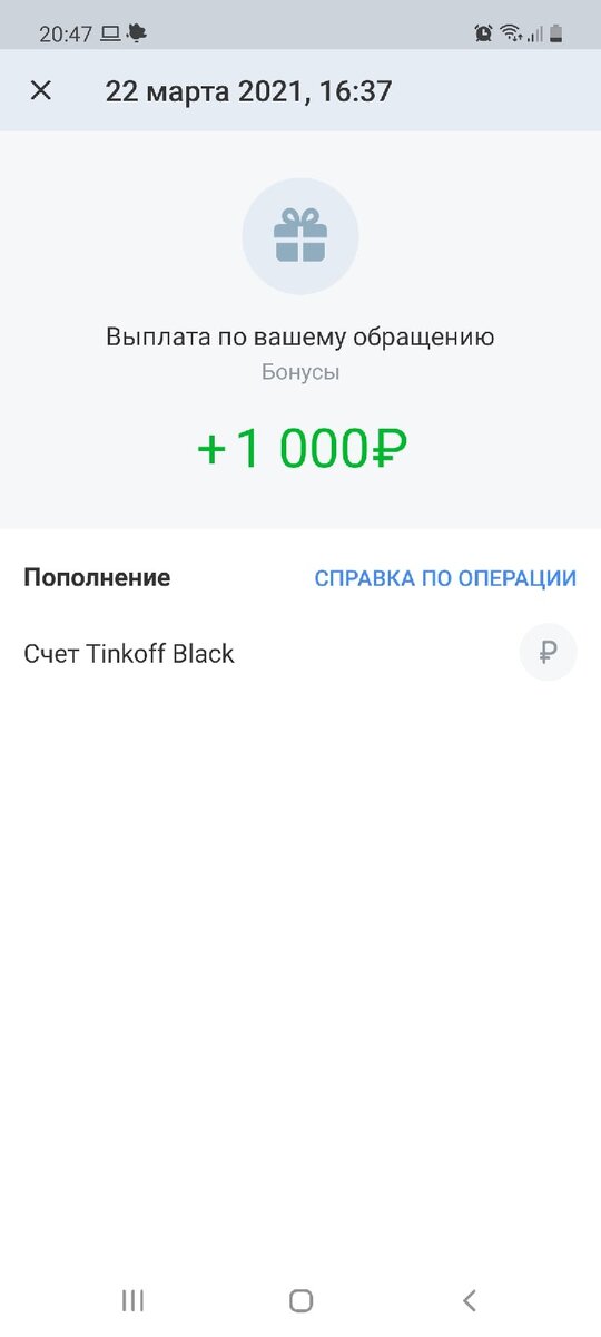 Чтобы вы думали, на следующий день, мне приходит сообщение о том, что «Тинкофф» мне перечислил 1000 рублей. По сути, это были деньги Сбербанка, которые стали комиссией по вине «Тинькофф». Вот так вот моя истерика и копание в законах помогли поставить все на свои места. А Сбер так и не ответил…