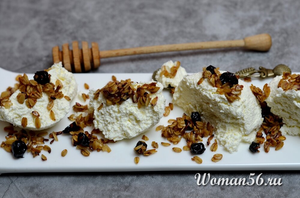 Хотя маскарпоне изготавливают с расчетом на дальнейшее использование в чизкейке и тирамису, уже сам по себе этот сыр является изысканным десертом. Стоит лишь добавить немного контрастных вкусовых акцентов – посыпав домашний маскарпоне карамелизированными хрустящими овсяными хлопьями и ягодами черной смородины.