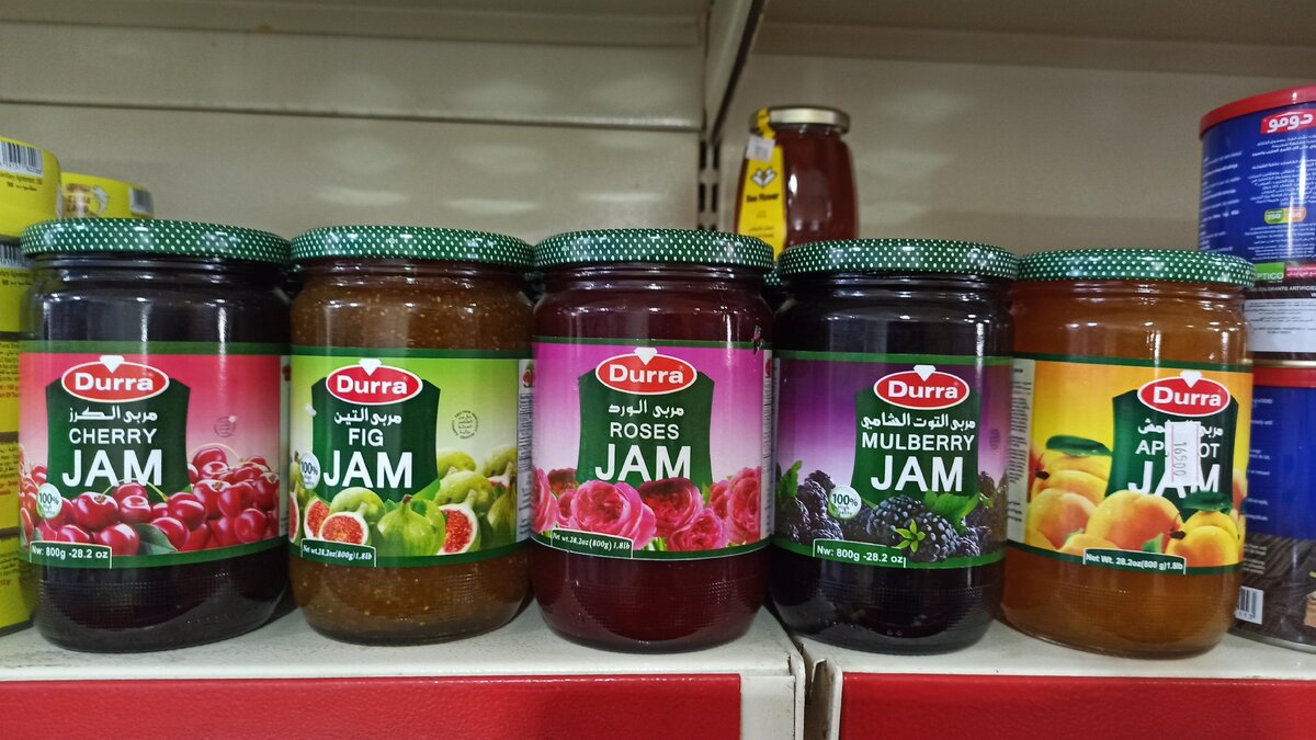 Сегодня немного расскажу вам о том, что производится сегодня в Сирии. Большинство этих товаров сирийцы поставляют на экспорт, в основном - в соседние Ливан и Иорданию. Товары эти качественные и спросом пользуются. Например, разного рода консервированные овощи, фрукты и варенья. Вот, к примеру, вареньки известной сирийской фирмы Дурра. Нет, не дура. Кстати, "дура" но с 1 буквой р, это на арабском - кукуруза. А это фамилия, перевод сейчас не скажу, не сталкивалась.