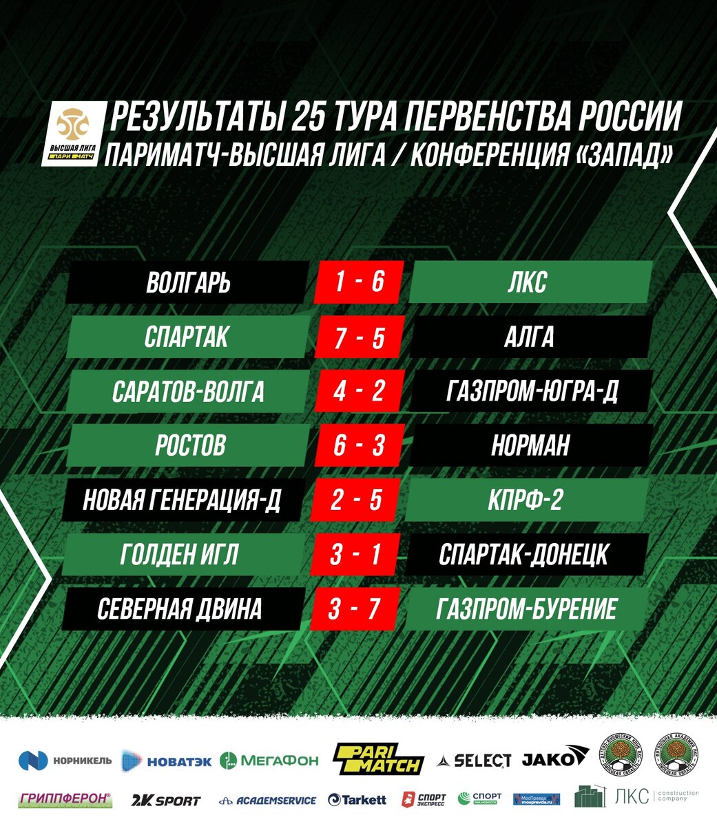 Победитель турнира определится в заключительном туре. ЛКС 27 марта сыграет на выезде с московским «Спартаком», а «Газпром Бурение» дома примет «Голден Игл». Турнирную таблицу после 25-го тура вы можете посмотреть на сайте мини-футбольного клуба ЛКС .