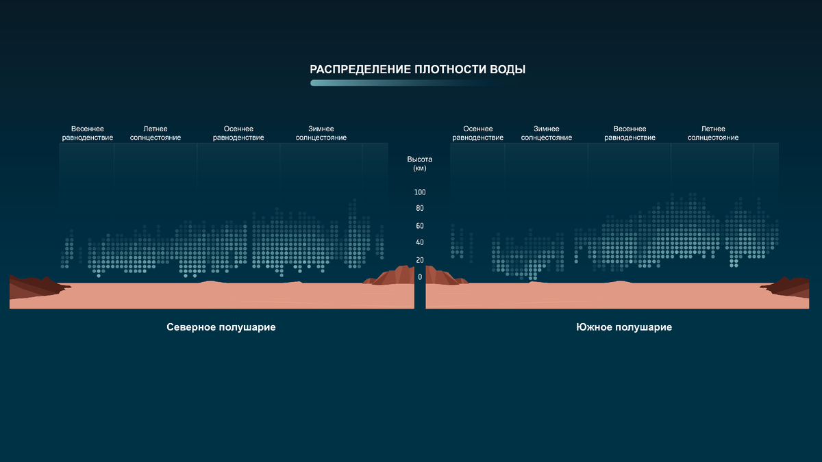 Обработав данные SPICAM за восемь марсианских лет, Анна Фёдорова , руководитель лаборатории экспериментальной спектроскопии ИКИ РАН, и её коллеги обнаружили, что в периоды, когда Марс находится дальше от Солнца, водяной пар практически не поднимается выше отметки в 60 км. Это происходит, когда планета находится в афелии — точке орбиты, наиболее удаленной от Солнца (орбита Марса более вытянута по сравнению с земной, поэтому разница заметна, 207 и 249 миллионов км). В это время в северном полушарии лето, в южном — зима. Напротив, когда Марс проходит перигелий, ближайшую к Солнцу точку (во время южной зимы), водяной пар может подниматься до 90 км над поверхностью, не конденсируясь в лед. Концентрация водяного пара в этот период может достигать 100 частиц на миллион в единице объёма.