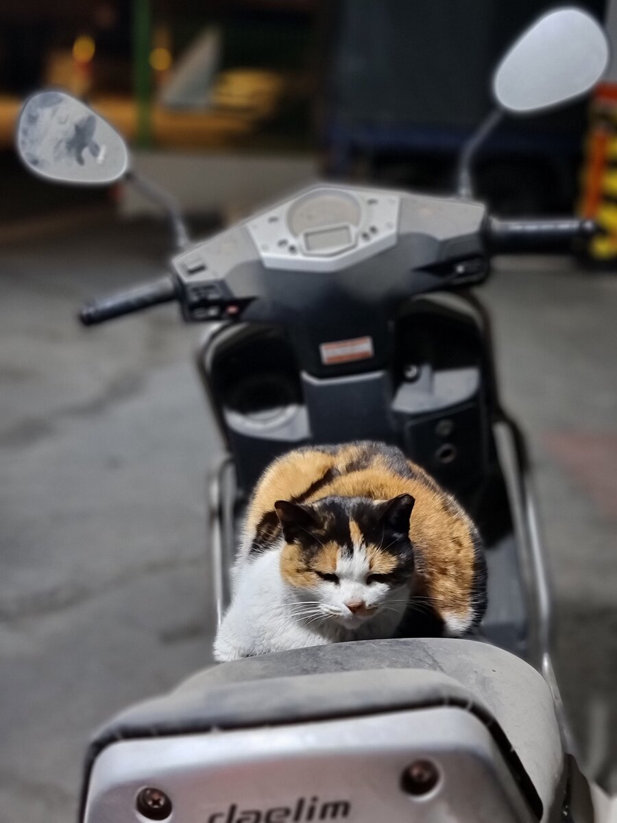 Наглый (или бесстрашный ) кот был замечен вчера поздним вечером в одном из сеульских дворов. Развалившись на сиденье, он чувствовал себя хозяином пыльного мопеда.