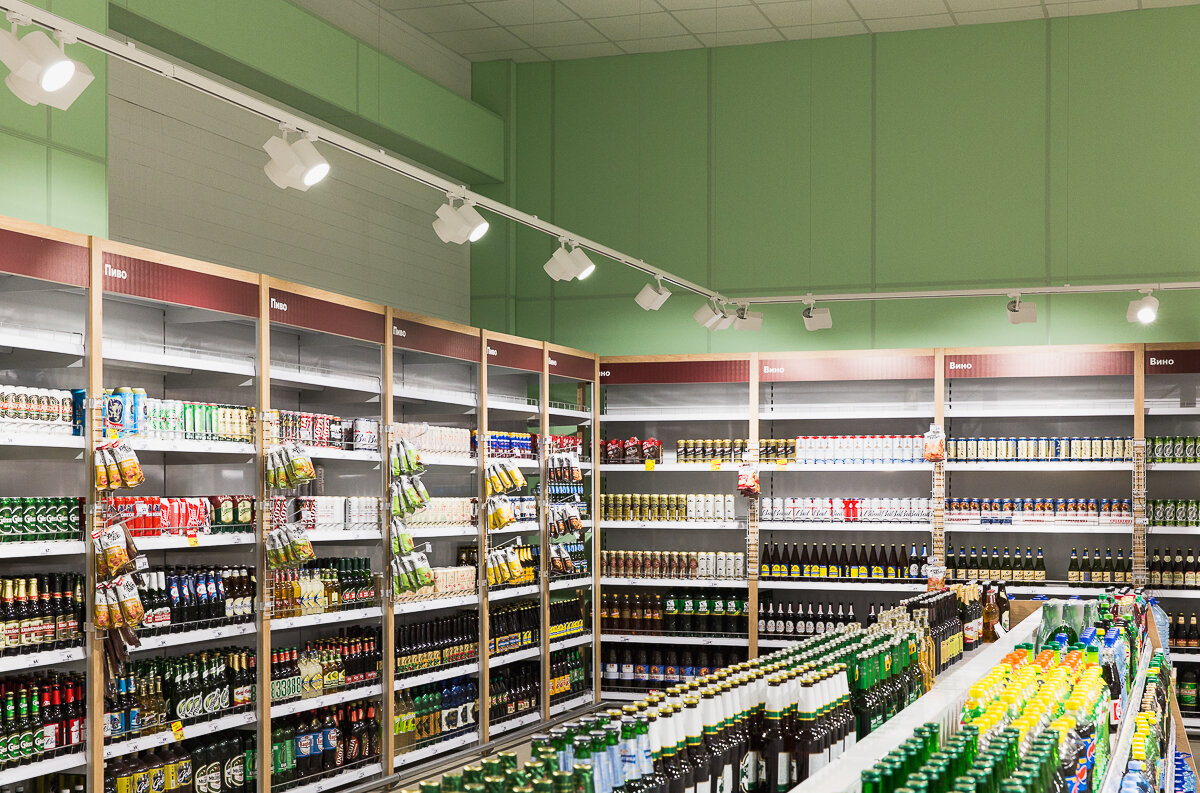 Какую задачу нужно решить при разработке проекта освещения продуктового магазина? В первую очередь — добиться оптимального баланса между общим и акцентированным светом в каждой торговой зоне. Так мы поможем клиентам, которые предоставлены сами себе, и обеспечим им достаточную освещенность для передвижения и выбора товаров.