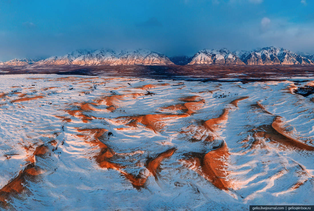 13. Чарские пески остаются покрытыми снегом до середины апреля. Во время таяния снег оставляет на желтом песке причудливые орнаменты.