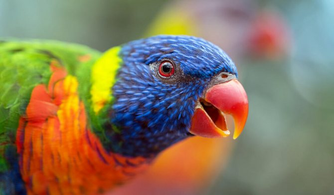 Лорикет — попугаи с поразительно ярким контрастным оперением. Их отличием от собратьев является… язык. Дело в том, что в природе лори питаются мягкой пищей и своим язычком, похожим на щеточку как бы вычерпывают еду. Поэтому им не нужен мощный клюв и он у них достаточно хрупкий.