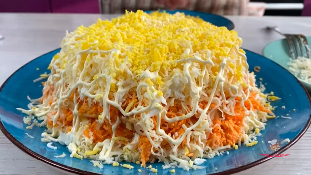 - Также на мелкой терке натираем сыр и плавленные сырки. Собираем салат.