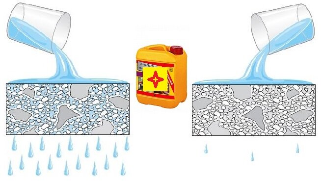 - Гидрофобизаторные добавки. Гидрофобизатор является смесью на основе акрила или кремнийорганических веществ. Поверхностный способ нанесения добавок этого типа позволяет использовать их для уже готовых бетонных изделий. Глубина пропитки бетона гидрофобизатором составляет вплоть до нескольких сантиметров. Благодаря обработке этим составом, поверхность бетона приобретает водоотталкивающие свойства, механическая прочность и стойкость к растрескиванию.
