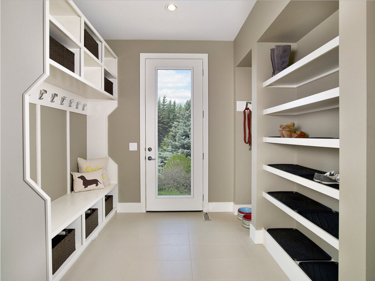- Не забудьте продумать хранение таким образом, чтобы на полки помещалась высокая обувь. Здорово, если полки можно переставлять по высоте или просто убирать одну из полок, когда наступает сезон холодов, чтобы разместить сапоги.