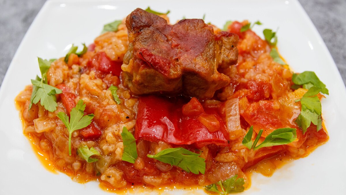 Густое ароматное рагу с мясом готово. Это популярное блюдо в Болгарии и странах Балканского полуострова. Его подают, формирую подушку из риса, на которую кладут мясо, а сверху присыпают измельчённой петрушкой. Гювеч можно готовить из любых сезонных овощей, а вместо свинины можно взять говядину или курицу.