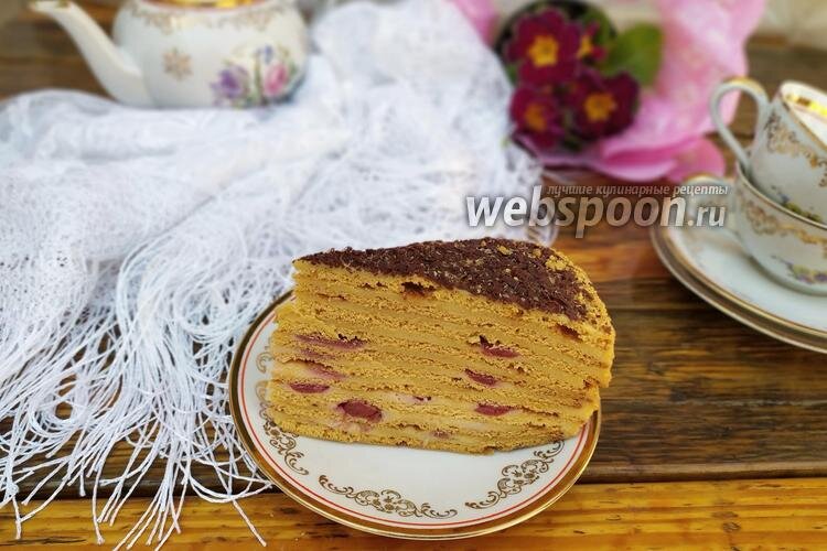 Рецепт на сайте: https://webspoon.ru/receipt/medovik-s-zavarnym-kremom-i-vishnejj