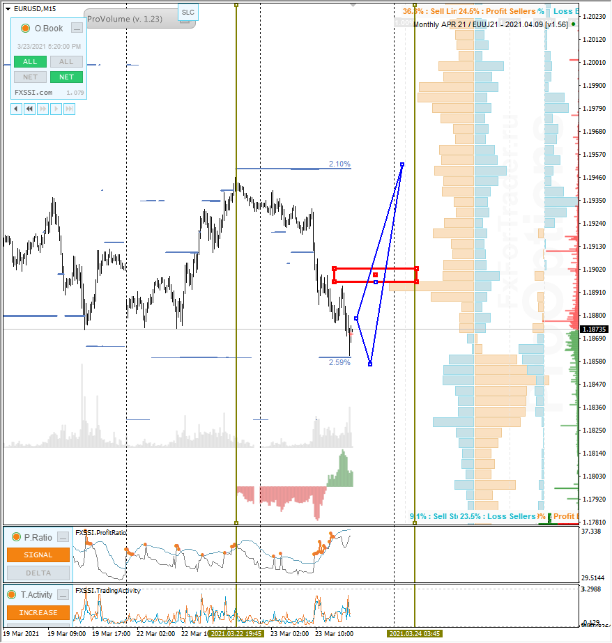 С началом американской сэссии можем получить обратное движение, т.е. рост. Нарисовал зону пробой которой будет сигналом к лонгам. Целей в верху много и некоторые из них далеко, так что сделка может быть не на один день. Ну а коли я не прав так стопы меня рассудят)))