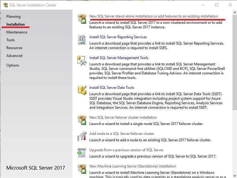 2) Открываете дистрибутив и запускаете установку. В меню слева нажимаете "Installation" => New SQL Server stand-alone installation
