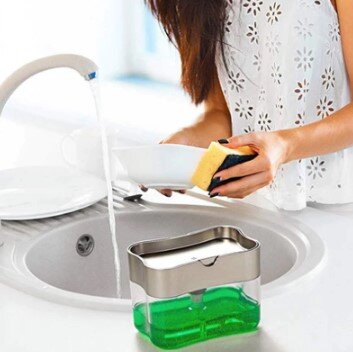 Долой банки с моющими средствами возле раковины. Теперь для того, чтобы смочить губку моющим средством, достаточно просто положить её сверху и сделать