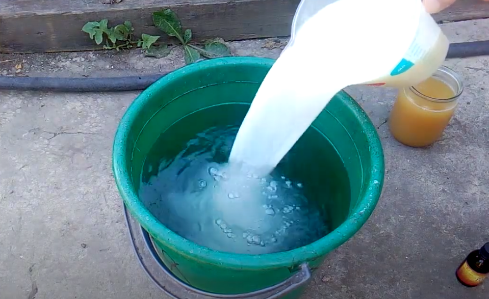 Теперь я добавляю еще один ингредиент. Я добавляю сюда йод. Добавил уже шестнадцать капель и теперь добавляю оставшиеся четыре и потом нам останется только это все хорошенько перемешать, перемешиваем и заправляем опрыскиватель. Опрыскиватель я буду заправлять через марлю, как говорится, на всякий случай.