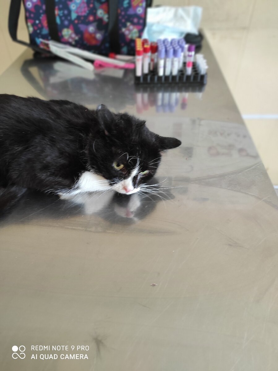 К сожалению,Финик оказался совсем не ориентированный на человека и на помещение,так как всю жизнь он жил в подвале дома и никогда не был домашним! для него был огромный стресс оказаться в новой обстановке.....на этой почве у него обострились разные болячки...сначала у него обострился гастрит,позже он по второму кругу переболел ринотрахеитом и начала выпадать шерсть.....так продолжаться не могло и мы в срочном порядке повезли его на полное обследование,анализы показали,что у Финика кальцивирус((