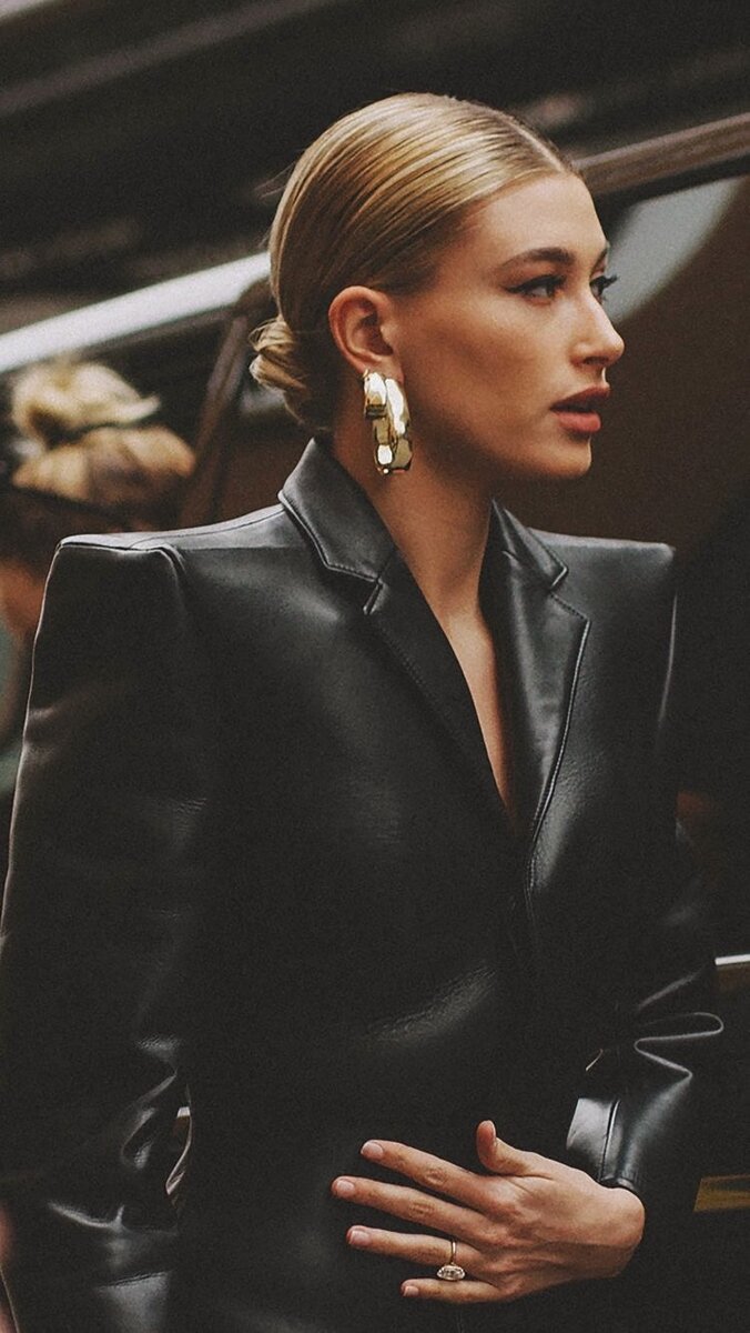 Главной особенностью стилизации кожаных пиджаков в этом сезоне стали смелые сочетания разных фактур и оттенков кожи в одном образе. Удачные и эффектные примеры можно подсмотреть у Беллы Хадид, которая к кожаному костюму бутылочного цвета добавила объемную мягкую сумку из металлизированной кожи.