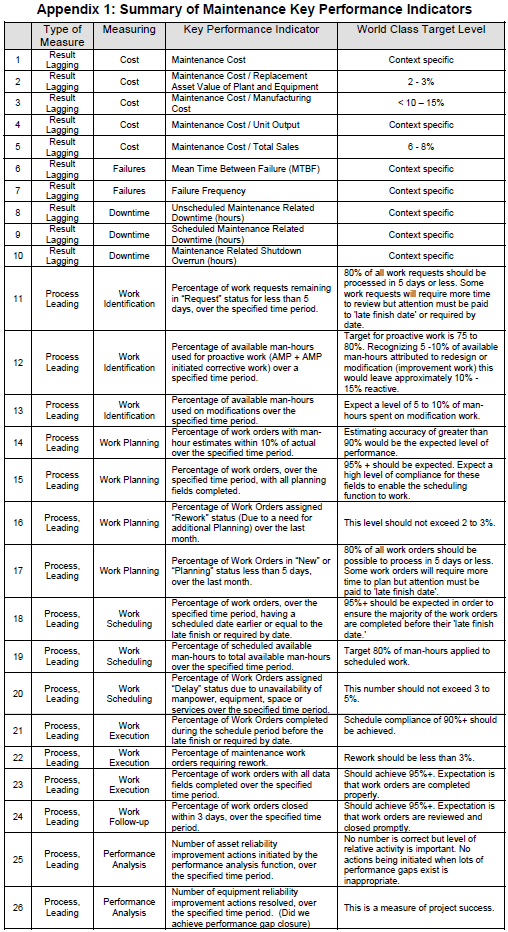 Хороший свод показателей эффективности технического обслуживания и ремонта (ТОиР), включающий их целевые значения, соответствующие лучшей практике (world class). Взят из документа Ivara Corporation.