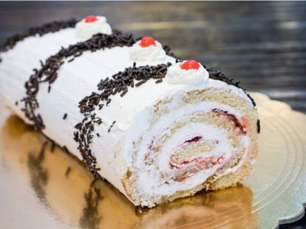 - Поверхность рулета смажьте кремом, при желании украсьте ягодами.